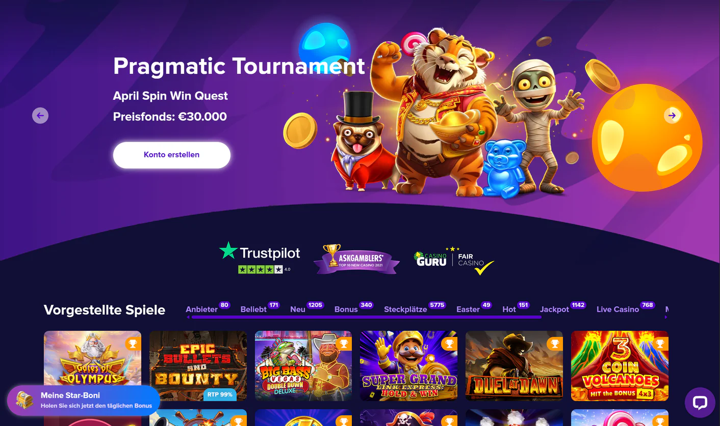 Das Stelario Casino ist seit 2020 auf dem Markt und hat sich als einer der interessantesten Online-Anbieter für deutsche Spieler etabliert. Mit über 4.000 Spielen, einem großzügigen Willkommensbonus von bis zu 1.200 € und 275 Freispielen sowie einer Curaçao-Lizenz bietet Stelario ein vollständiges Glücksspielerlebnis. In diesem Testbericht erfahren Sie alles über Bonusbedingungen, Auszahlungsdauer, Seriosität und den Login-Prozess – damit Sie bestens informiert spielen können. Jetzt registrieren und loslegen!